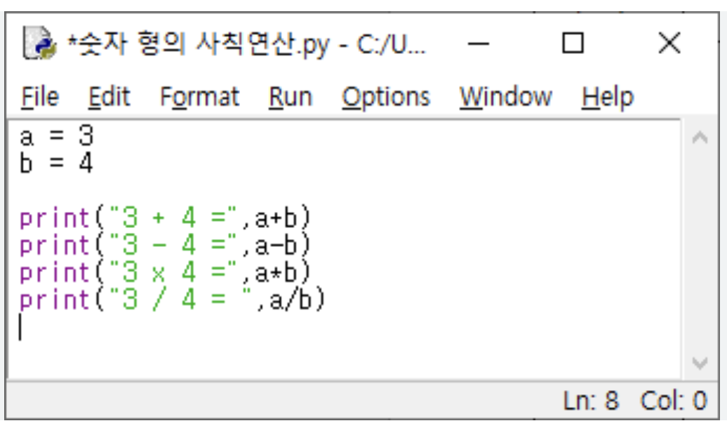 - 사칙연산 파일형으로 실행.print(4+2), 숫자 4와 숫자2를 ‘+’연산자를 통해 더한 결과값을 print하시오.