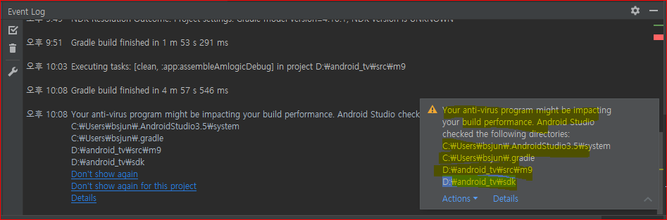 안드로이스 스튜디오 빌드 속도 개선, 윈도우10 defender 설정