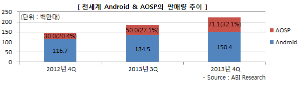 AOSP(이 포스팅에서는 'Forked Android'와 동일한 의미로 사용하겠다)의 성장세가 어느 정도인지 수치로 살펴보도록 하자. ABI Research에 의하면 2013년 4분기 AOSP의 판매량은 7,100만대로 전년동기대비 137%가 성장하였다. 전체 안드로이드의 32.1%, 전체 스마트폰의 25%에 해당하는 비중이다.