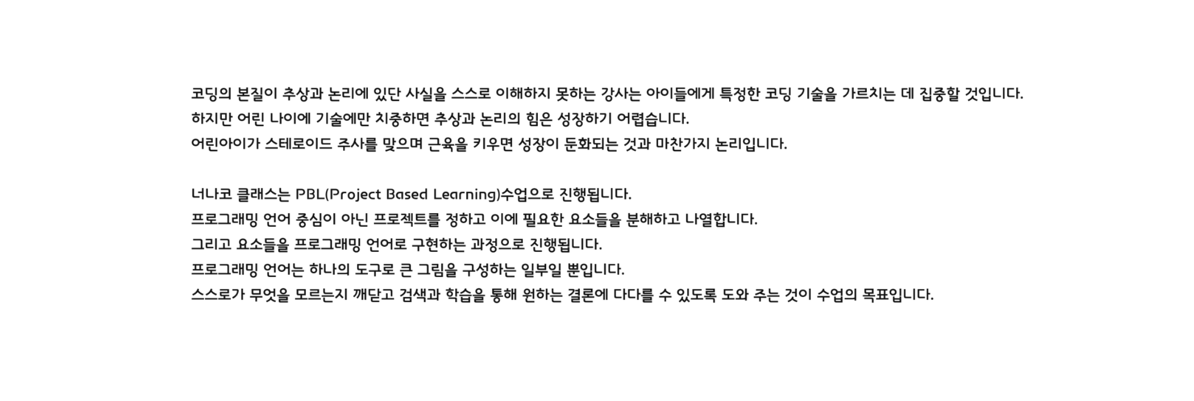 너나코 코딩클래스는 PBL(Project Based Learning)수업으로 진행됩니다.